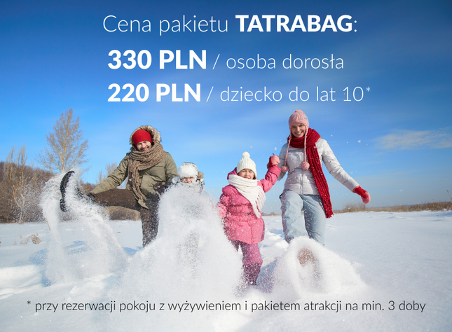 Pakiet TATRABAG to kompleksowa oferta ferii w górach w wyjątkowo korzystnej cenie. W ramach pobytu otrzymujesz m.in. noclegi, wyżywienie, atrakcje, prelekcje i animacje dla dzieci.